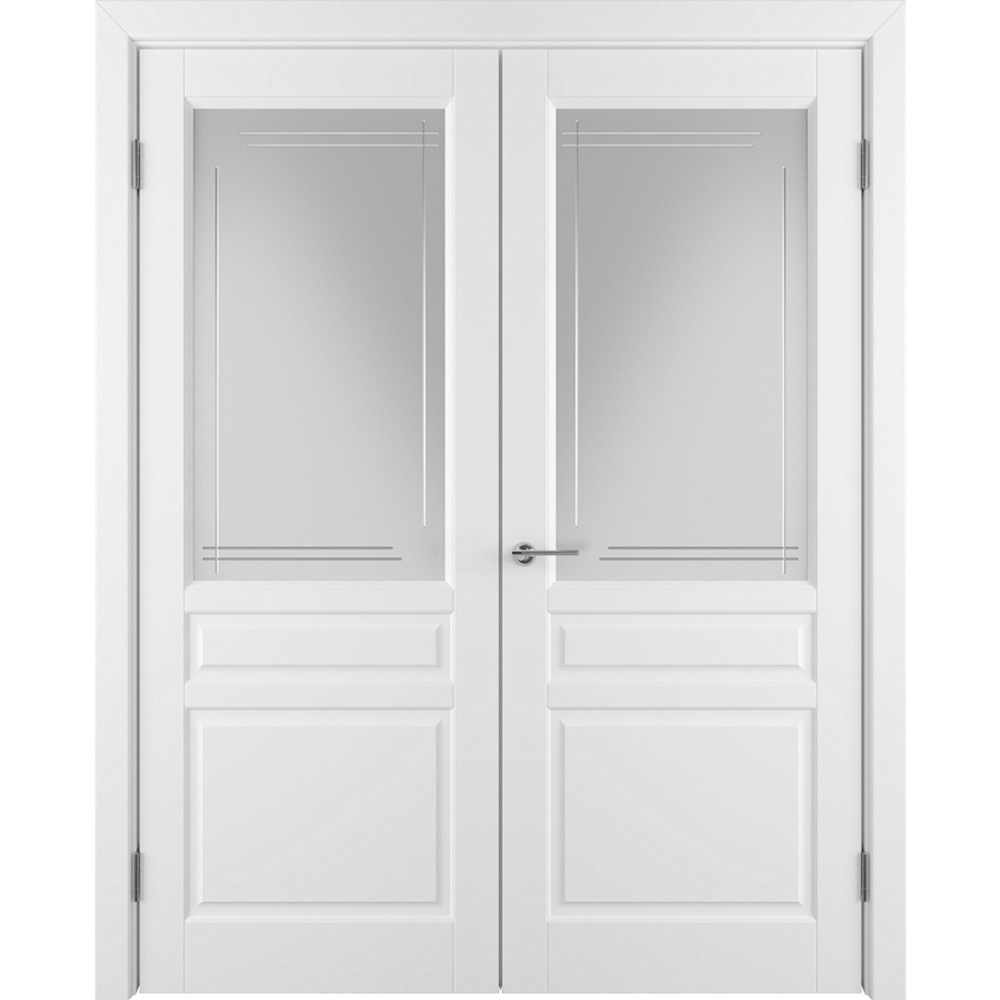 Межкомнатная дверь массив ольхи ОКА Лондон 2 белая эмаль распашная двустворчатая остеклённая